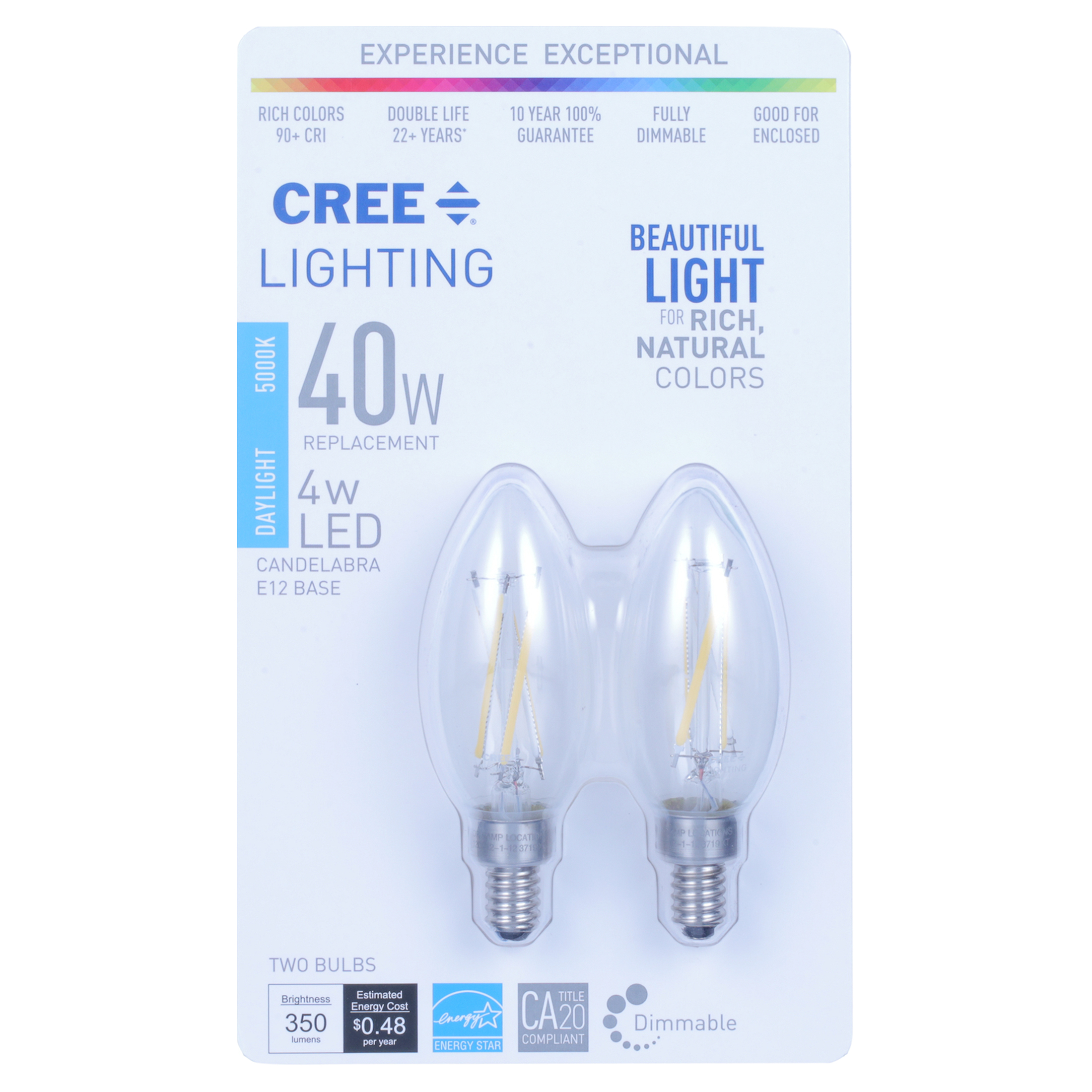 Cree Lighting B11 Clear Glass Filament Candelabra 40w Equivalent Led Bulb 350 Lumens Dimmable Daylight 5000k 25 000 Hour Rated Life 90 Cri Good For Enclosed 1 Pack Walmart Com